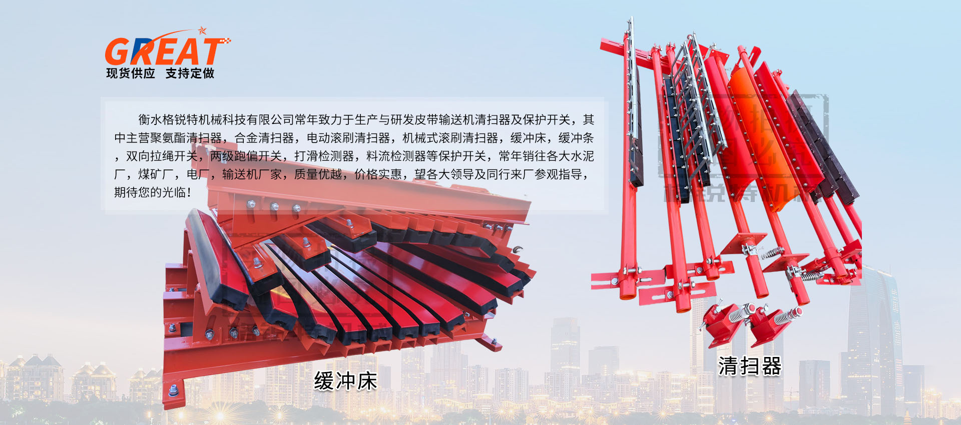 衡水格銳特機(jī)械科技有限公司常年致力于生產(chǎn)與研發(fā)皮帶輸送機(jī)清掃器及保護(hù)開(kāi)關(guān),其中主營(yíng)聚氨酯清掃器,合金清掃器,電動(dòng)滾刷清掃器,機(jī)械式滾刷清掃器,緩沖床,緩沖條,雙向拉繩開(kāi)關(guān),兩級(jí)跑偏開(kāi)關(guān),打滑檢測(cè)器,料流檢測(cè)器等保護(hù)開(kāi)關(guān),常年銷(xiāo)往各大水泥廠,煤礦廠,電廠,輸送機(jī)廠家,質(zhì)量?jī)?yōu)越,價(jià)格實(shí)惠,望各大領(lǐng)導(dǎo)及同行來(lái)廠參觀指導(dǎo),期待您的光臨?。?!